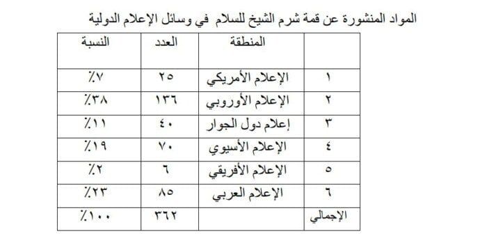 يشير التحليل الإحصائي الذي قامت به الهيئة العامة للاستعلامات لحجم وتوجهات التناول العالمي الدولي للقمة، إلى سيطرة الاتجاه الإيجابي على نحو 92% من المواد المنشورة مقابل%8 فقط في الاتجاه السلبي.