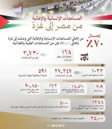 كشفت الإحصائيات التي أعلنتها وزارة الخارجية المصرية، الخاصة بالجهود المصرية الإنسانية والإغاثية لدعم الأشقاء في قطاع غزة، أن 70% من المساعدات التي أُرسلت لقطاع غزة جاءت من جانب الدولة المصرية، بإجمالي 550 ألف طن من المساعدات الطبية والغذائية، كما شملت الجهود، إرسال نحو 3730 طنًا من المساعدات من خلال 168 عملية من عمليات الإنزال الجوي التي نفذتها مصر.