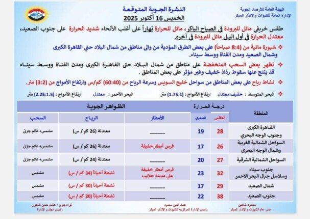 كشفتِ الهيئة العامة للأرصاد الجوية عن حالة الطقس اليوم الخميس 16 أكتوبر 2025 في محافظات ومدن مصر، فيسود اليوم طقس مائل للحرارة نهارًا على القاهرة الكبرى والوجه البحري والسواحل الشمالية وشمال الصعيد.