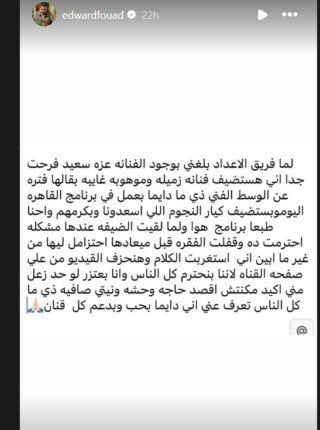 وأضاف إدوارد: «وإحنا طبعًا برنامج هوا ولما لقيت الضيفة عندها مشكلة احترمت ده وقفلت الفقرة قبل ميعادها احترامًا ليها من غير ما أبين إني استغربت الكلام وهنحذف الفيديو من على صفحة القناة لإننا بنحترم كل الناس» واختتم رسالته قائلاً: «وأنا بعتذر لو حد زعل مني أكيد مكنتش أقصد حاجة وحشة ونيتي صافية زي ما كل الناس تعرف عني إني دايماً بحب وبدعم كل فنان».