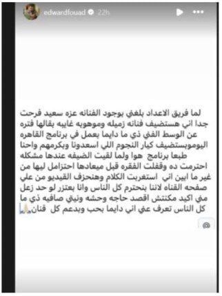 وكتب إدوارد: «لما فريق الإعداد بلغني بوجود الفنانة عزة سعيد فرحت جدًا إني هستضيف فنانة وزميلة وموهوبة غايبة بقالها فترة عن الوسط الفني زي ما دايمًا بعمل في برنامج القاهرة اليوم وبستضيف كبار النجوم اللي أسعدونا وبكرمهم».