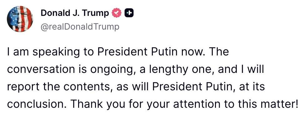 ونشر الحساب الرسمي للبيت الأبيض على "فيسبوك" نص تصريح ترامب وجاء كالتالي: "أتحدث الآن مع الرئيس بوتين، المحادثة مستمرة، وهي محادثة مطولة، وسأبلغكم بمضمونها، كما سيفعل الرئيس بوتين، عند اختتامها".