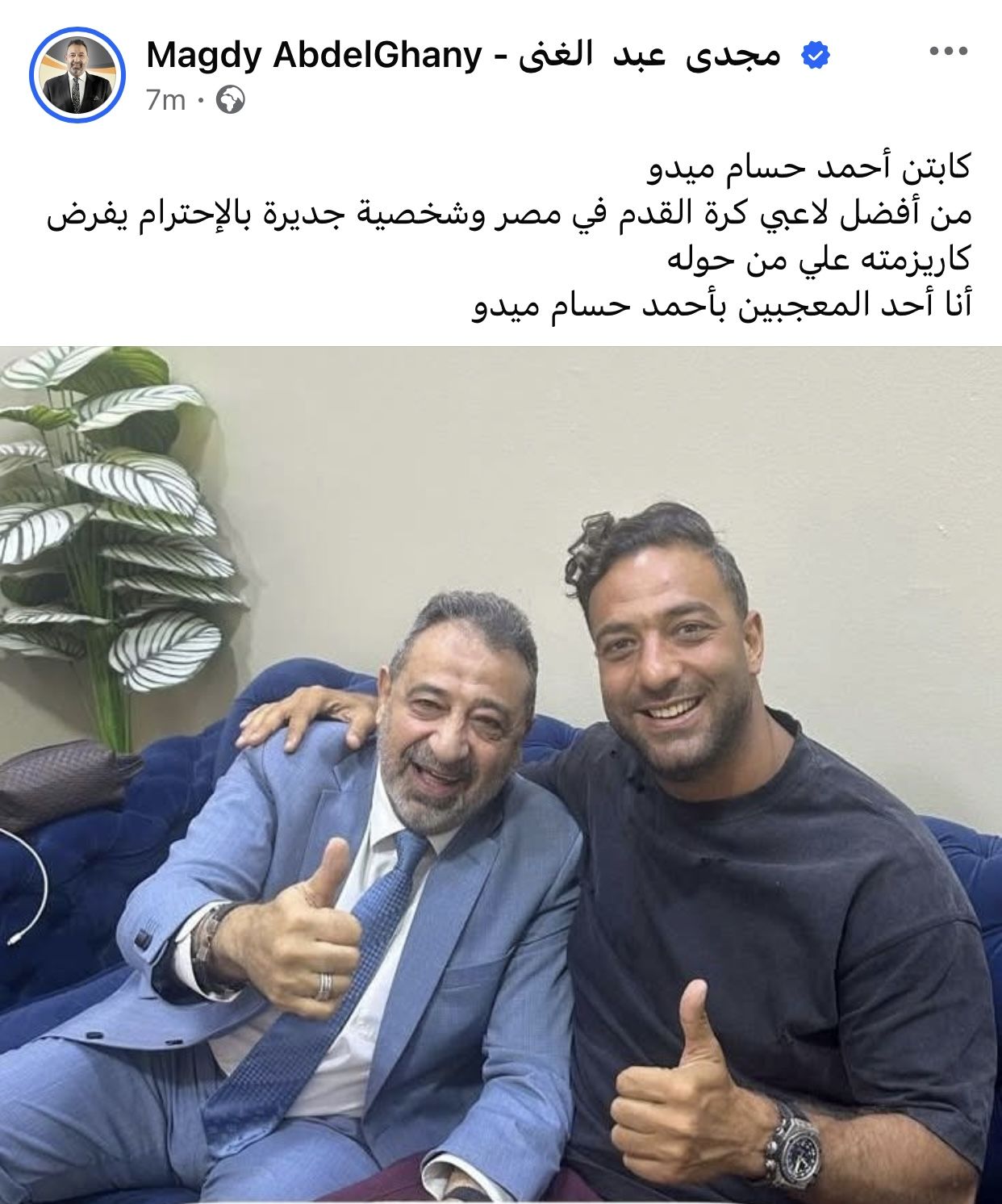 وعلق مجدي عبدالغني على الصورة قائلاً: "كابتن أحمد حسام ميدو، من أفضل لاعبي كرة القدم في مصر وشخصية جديرة بالاحترام يفرض كاريزمته على من حوله، أنا أحد المعجبين بأحمد حسام ميدو".