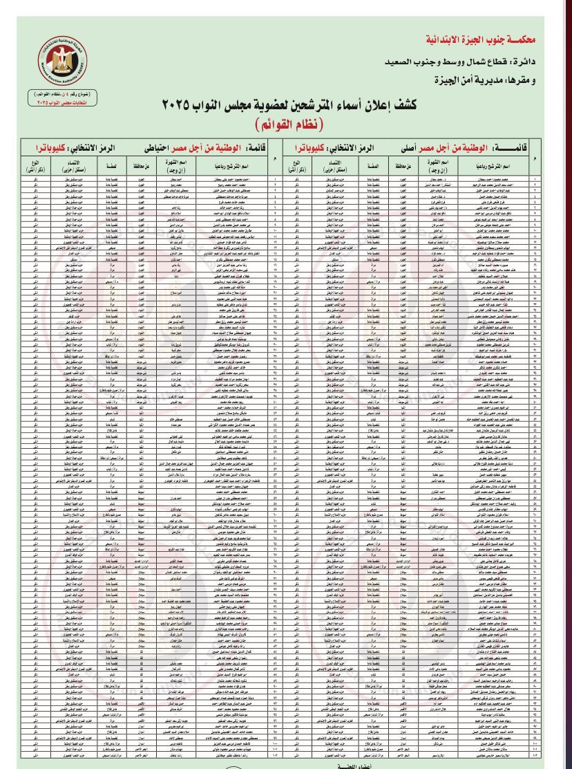 أعلنت الهيئة الوطنية للانتخابات عن أسماء القائمة المرشحة بدائرة قطاع شمال ووسط وجنوب الصعيد لانتخابات مجلس النواب 2025.
