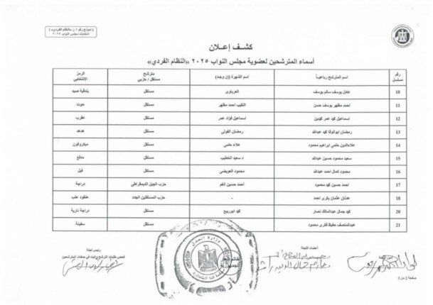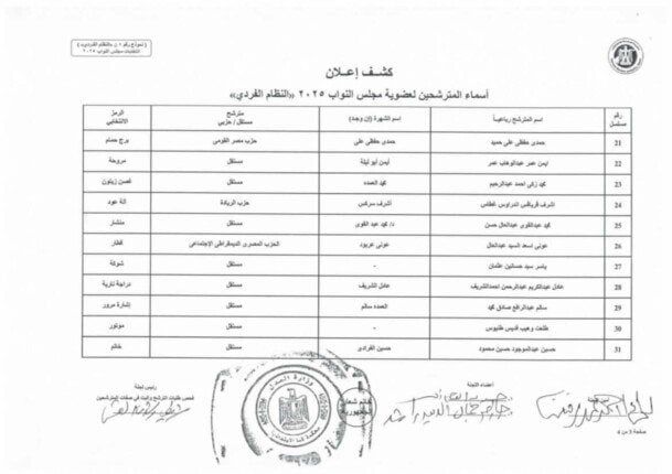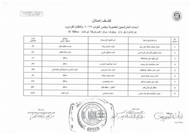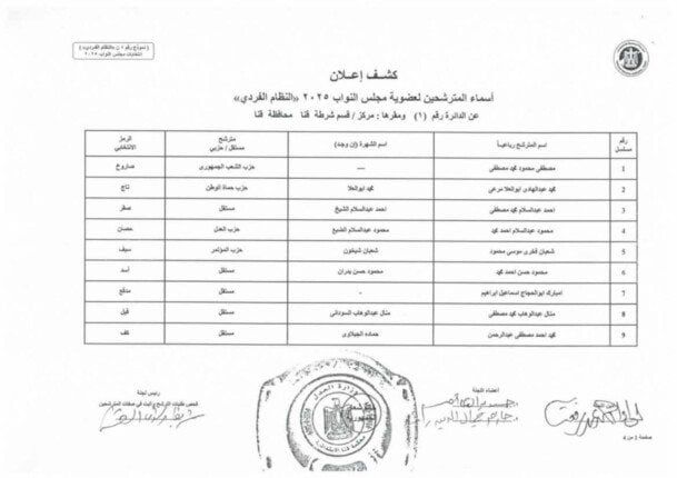 بالتوازي، تخوض القائمة الوطنية الموحدة السباق على 9 مقاعد تمثل النصف الآخر من مقاعد قنا (إجمالي 18 مقعدًا)، وتضم 9 مرشحين، بينهم 4 سيدات، يمثلون أحزاب: مستقبل وطن، حماة وطن، الوفد، العدل، والمصري الديمقراطي.