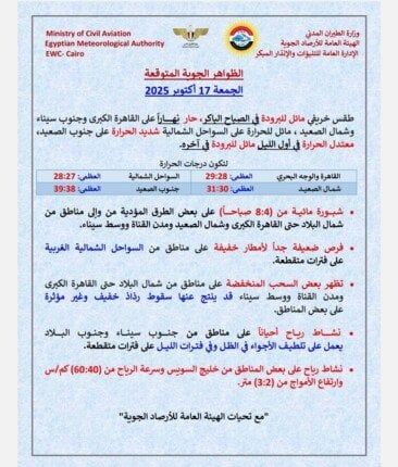الظواهر الجوية المتوقعة اليوم الجمعة 17 أكتوبر 2025