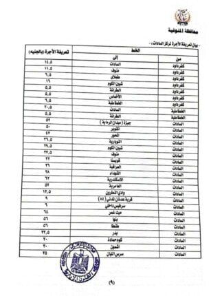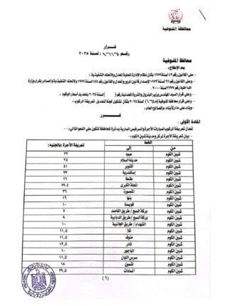 أصدر اليوم اللواء إبراهيم أبو ليمون محافظ المنوفية قرارا بشأن تعديل التعريفة الجديدة والمقررة لركوب سيارات الأجرة والسرفيس والتاكسي والتوك توك بدائرة المحافظة، وذلك عقب قرار لجنة التسعير التلقائي للمنتجات البترولية وزيادة أسعار البنزين والسولار اعتبارا من اليوم الجمعة الموافق 16 أكتوبر 2025.