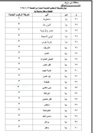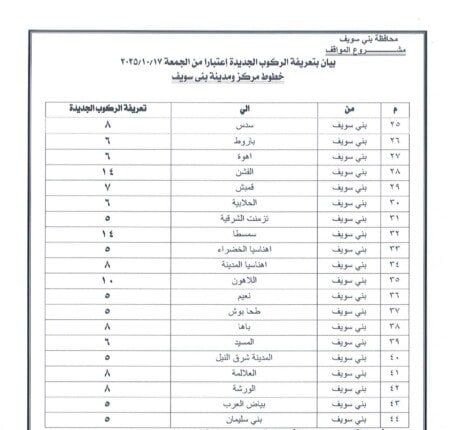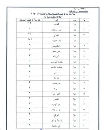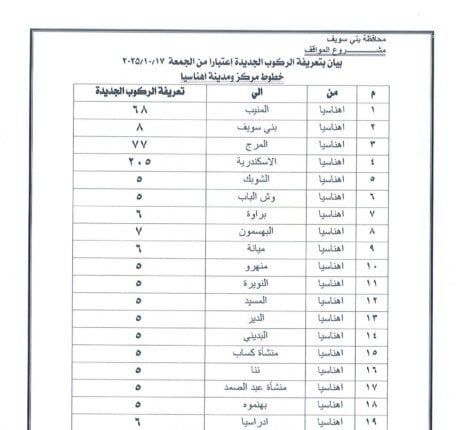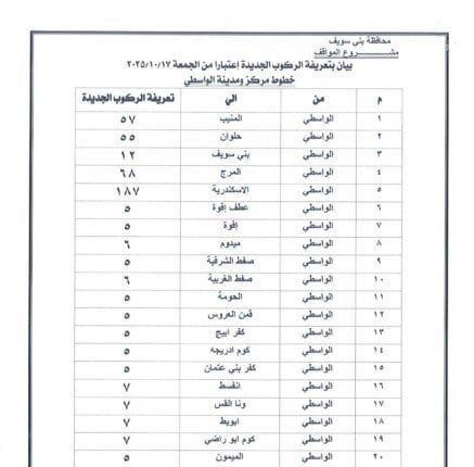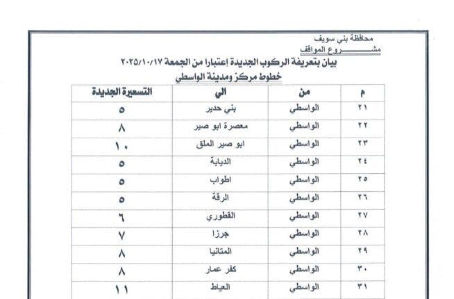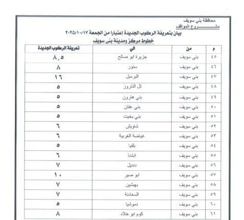 وجاءت التعريفة الجديدة بحيث تبلغ 5 جنيهات لسيارات السرفيس داخل مدينة بني سويف، و5 جنيهات بين المدينة وشرق النيل، و٨ جنيه لسرفيس شرق النيل موقف محور عدلي منصور، و20 جنيهًا للتاكسي داخل المدينة، و32 جنيهًا للتاكسي بين المدينة وشرق النيل.