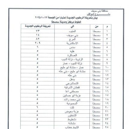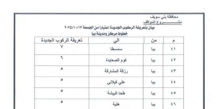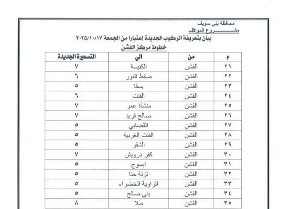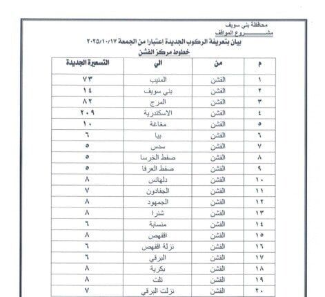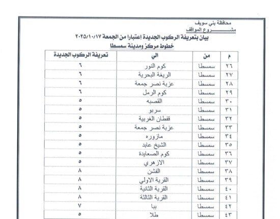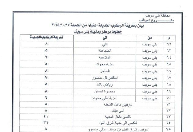 اعتمد الدكتور محمد هاني غنيم محافظ بني سويف التعريفة الجديدة للمواصلات الداخلية والخارجية لسيارات الأجرة والسرفيس والتاكسي داخل المحافظة وبين مراكزها الإدارية، وكذلك بين بني سويف والمحافظات الأخرى، وذلك عقب قرار الحكومة بتحريك أسعار المنتجات البترولية اعتبارًا من السادسة من صباح اليوم الجمعة 17 أكتوبر 2025، وما تضمنه القرار من تثبيت الأسعار داخل السوق المحلي لمدة عام كامل كحد أدنى.