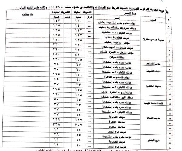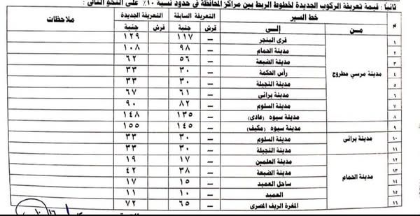 قرر اللواء خالد شعيب محافظ مطروح تحريك تعريفة الركوب الحالية لسيارات النقل الجماعي والسرفيس بنسبة في معظمها من ١٠ % تصل إلى ١٥% في عدد قليل من الخطوط سواء لخطوط السرفيس الداخلى أو الربط مع المحافظات والأقاليم مع متابعة انتظام سير العمل داخل جميع المواقف على مستوى مراكز ومدن محافظة مطروح