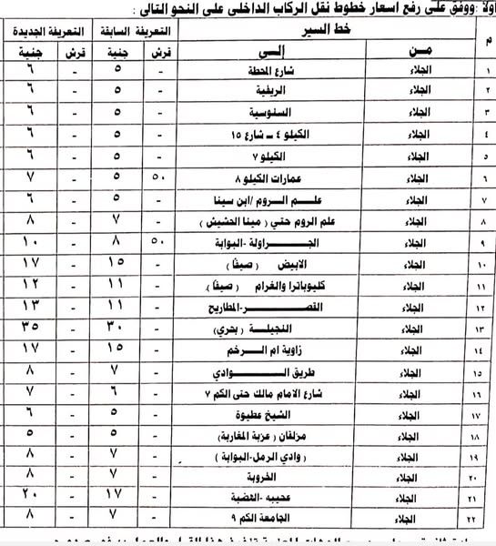 وجاءت قائمة تعريفة الأجرة لخطوط سير سيارات الأجرة الداخلية والخارجية كالتالي: