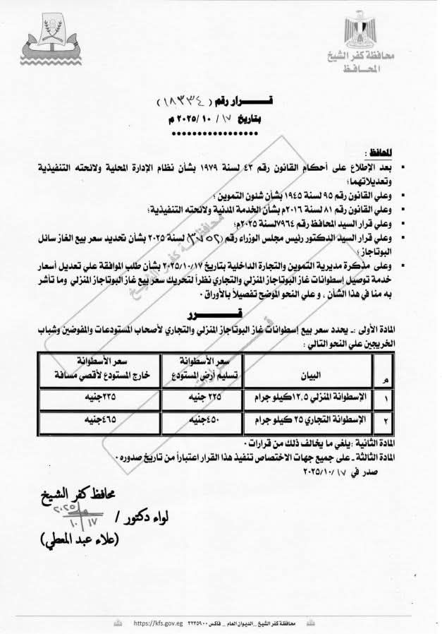 أصدر اللواء الدكتور علاء عبد المطلب، محافظ كفر الشيخ، اليوم الجمعة، القرار رقم 1834 لسنة 2025 بتحديد أسعار بيع أسطوانات غاز البوتاجاز المنزلي والتجاري.