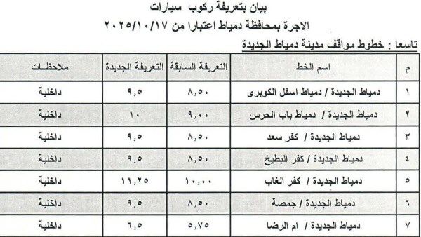 اعتمد الدكتور أيمن الشهابى محافظ دمياط، تعديل تعريفة الركوب لسيارات الأجرة بنطاق المحافظة، وفقًا لما هو موضح بالجداول المرفقة ، كما إعتمد تعديل تعريفة الركوب لسيارات التاكسي وذلك بفتح العداد الكيلو الأول من ١١.٥ جنيه إلى ١٣ جنيه والكيلو الذى يليه من ٣.٤٥ جنيه إلى ٣.٧٥ جنيه ، وذلك عقب قرار لجنة التسعير التلقائي بتحريك أسعار المواد البترولية اعتبارًا من اليوم.