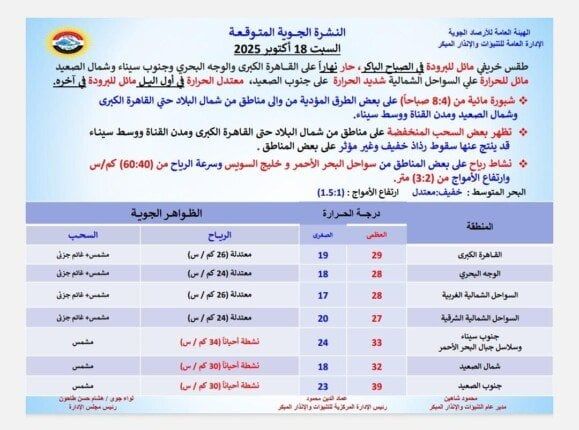 كشفتِ الهيئة العامة للأرصاد الجوية عن حالة الطقس اليوم السبت 18 أكتوبر 2025 في محافظات ومدن مصر، فيسود اليوم طقس حار نهارًا على القاهرة الكبرى والوجه البحري وجنوب سيناء وشمال الصعيد، مائل للحرارة على السواحل الشمالية، شديد الحرارة على جنوب الصعيد.