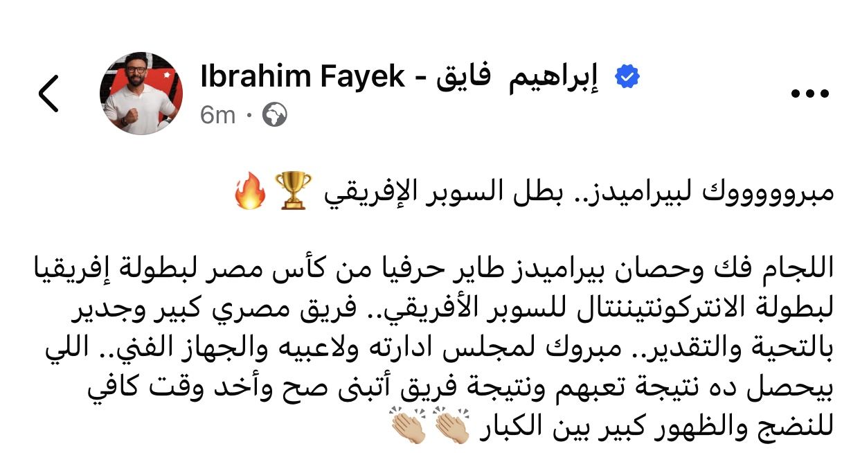 وقال فايق في منشور له عبر حسابه الرسمي بموقع فيسبوك: “مبروووووك لبيراميدز.. بطل السوبر الإفريقي اللجام فك وحصان بيراميدز طاير حرفيًا من كأس مصر لبطولة إفريقيا لبطولة الانتركونتيننتال للسوبر الأفريقي.. فريق مصري كبير وجدير بالتحية والتقدير.. مبروك لمجلس ادارته ولاعبيه والجهاز الفني.. اللي بيحصل ده نتيجة تعبهم ونتيجة فريق أتبنى صح وأخد وقت كافي للنضج والظهور كبير بين الكبار”.