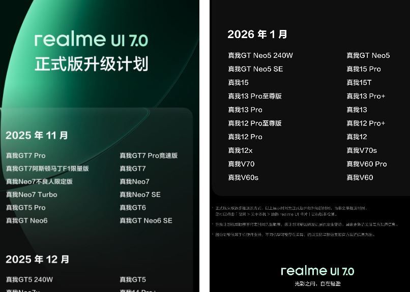 وفقًا لشركة Realme، سيتم إصدار الإصدار المستقر من Realme UI 7 أولاً لسلسلة Realme GT 7 Pro وGT 7 وGT 5 Pro وNeo 7 Turbo وGT Neo 6 في نوفمبر 2025.