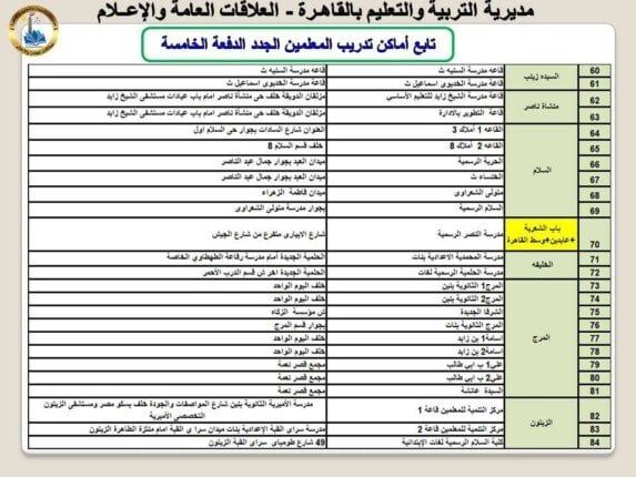 وجاءت أماكن تدريب وإعداد المعلمين الجدد المقبولين ضمن الدفعة الخامسة من مسابقة 30 ألف معلم في محافظة القاهرة، كالتالي: