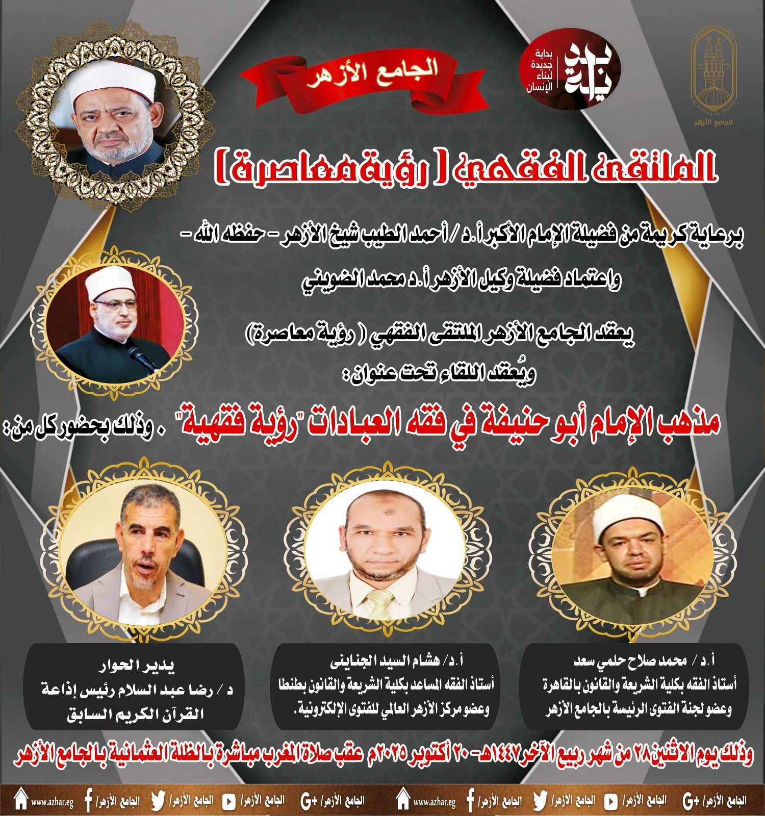 برعاية من فضيلة الإمام الأكبر أ.د أحمد الطيب، شيخ الأزهر، وبتوجيهات من فضيلة أ.د محمد الضويني، وكيل الأزهر الشريف، حيث يعقد اليوم الجامع الأزهر الملتقى الفقهي بين الشرع والطب الثاني والثلاثون بعنوان "رؤية معاصرة"، والذي يناقش على مائدته: مذهب الإمام أبو حنيفة في فقه العبادات "رؤية فقهية".