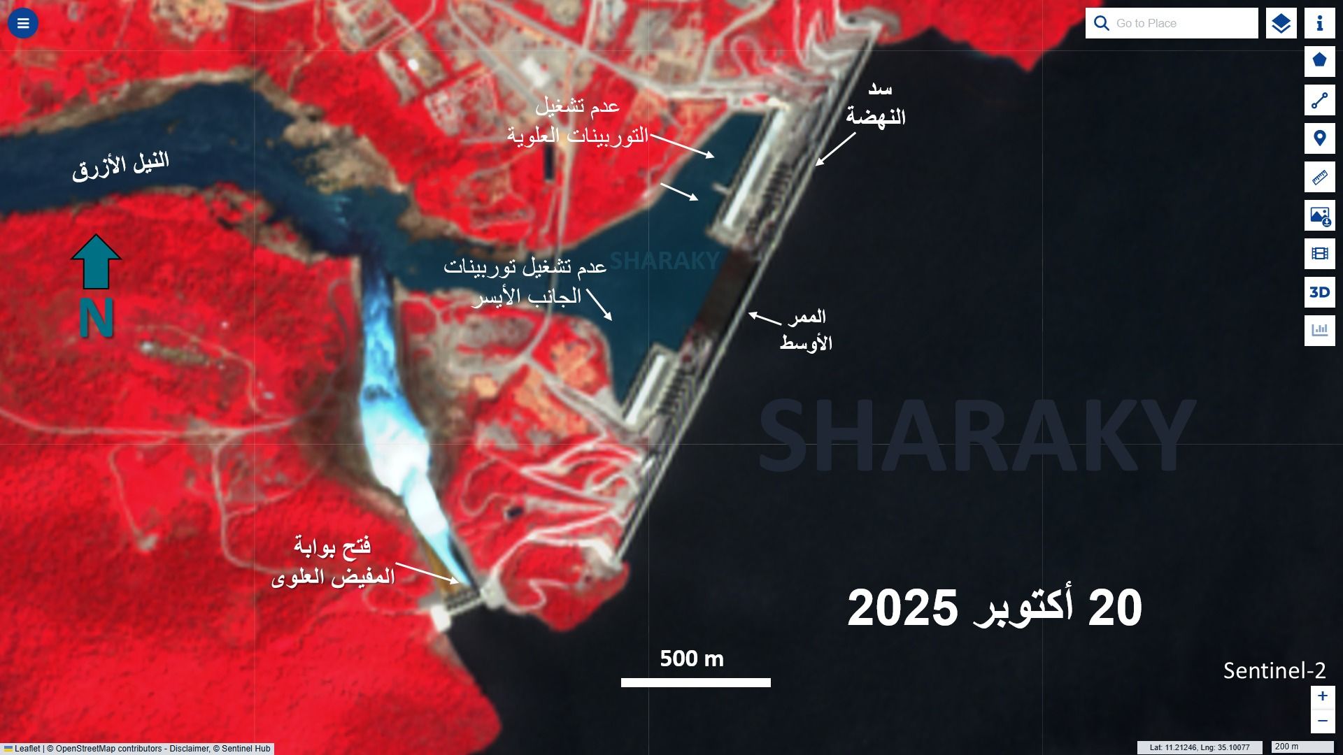 ونشر الدكتور عباس شراقي عبر صفحته الرسمية على فيسبوك أن الصور الفضائية التي تم تحليلها يوم 20 أكتوبر 2025 تؤكد استمرار توقف التوربينات بالكامل، مشيرًا إلى أن الإيراد اليومي من الأمطار عند سد النهضة سيشهد تراجعًا تدريجيًا ليصل إلى 150 مليون متر مكعب بنهاية الشهر الجاري، ثم 50 مليون متر مكعب بنهاية نوفمبر المقبل.