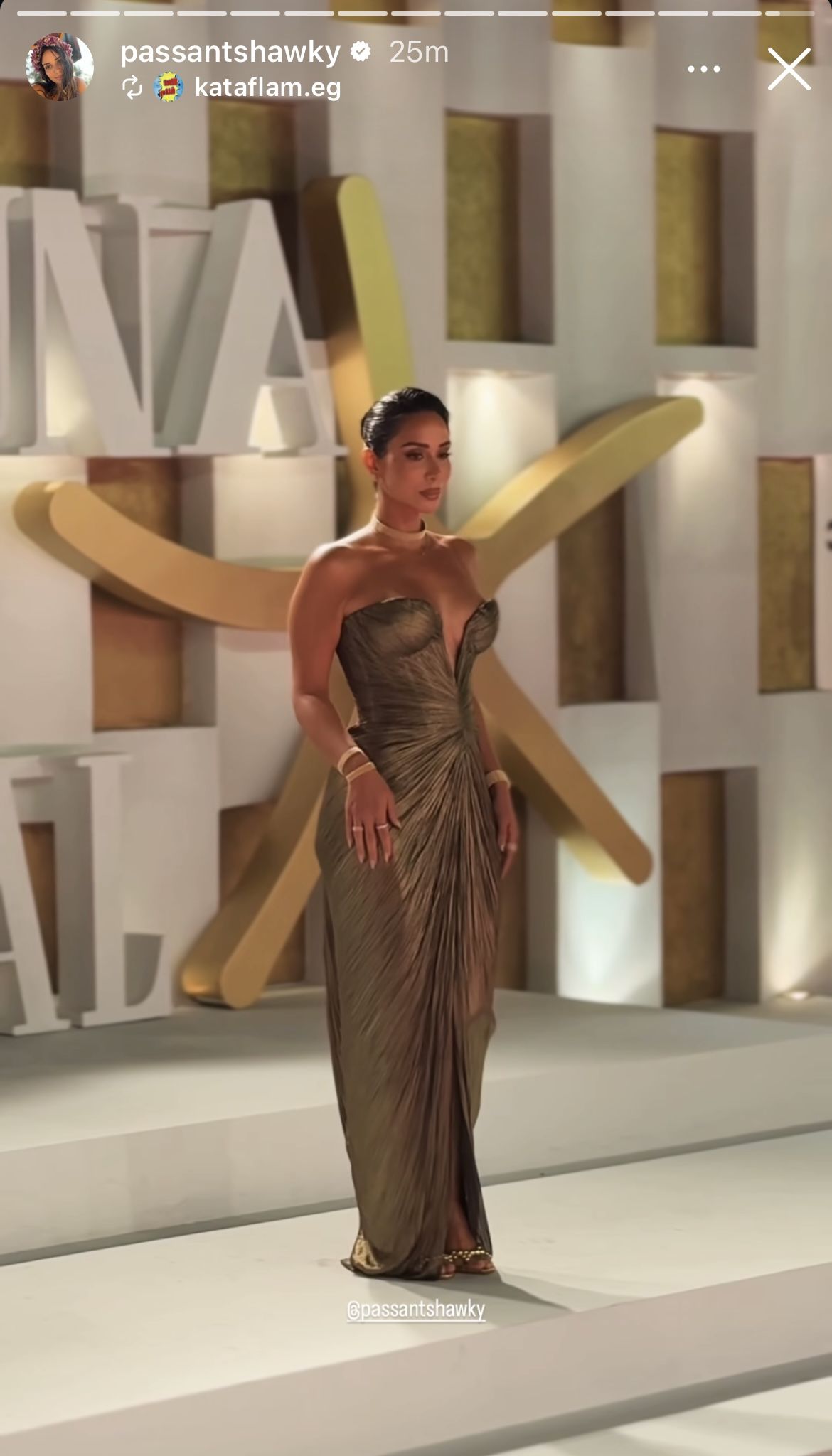وخطفت بسنت شوقي في الأنظار بإطلالة جذابة جريئة ، حيث ارتدت فستان باللون مجسم مفتوح منّ ناحية الصدر باللون البني.
