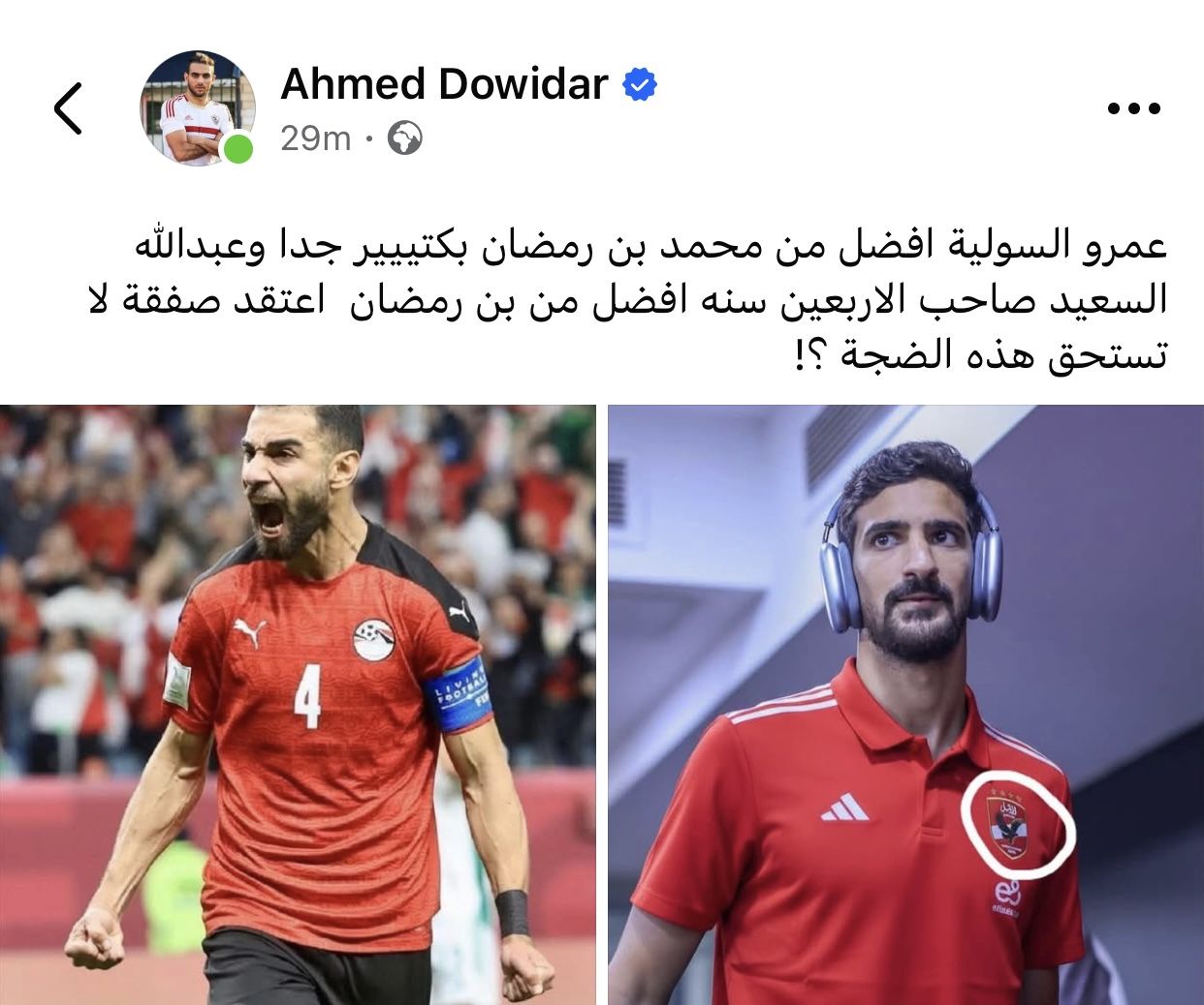 وكتب دويدار عبر حسابه الشخصي على موقع التواصل الاجتماعي فيسبوك: “عمرو السولية أفضل من محمد بن رمضان بكتير جدًا، وعبدالله السعيد صاحب الأربعين سنة أفضل منه، أعتقد الصفقة لا تستحق هذه الضجة!".