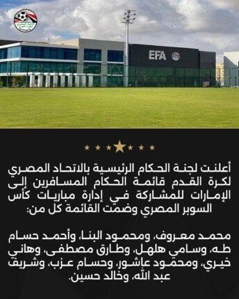 أعلنت لجنة الحكام الرئيسية بالاتحاد المصري لكرة القدم قائمة الحكام المسافرين إلى الإمارات للمشاركة في إدارة مباريات كأس السوبر المصري.
