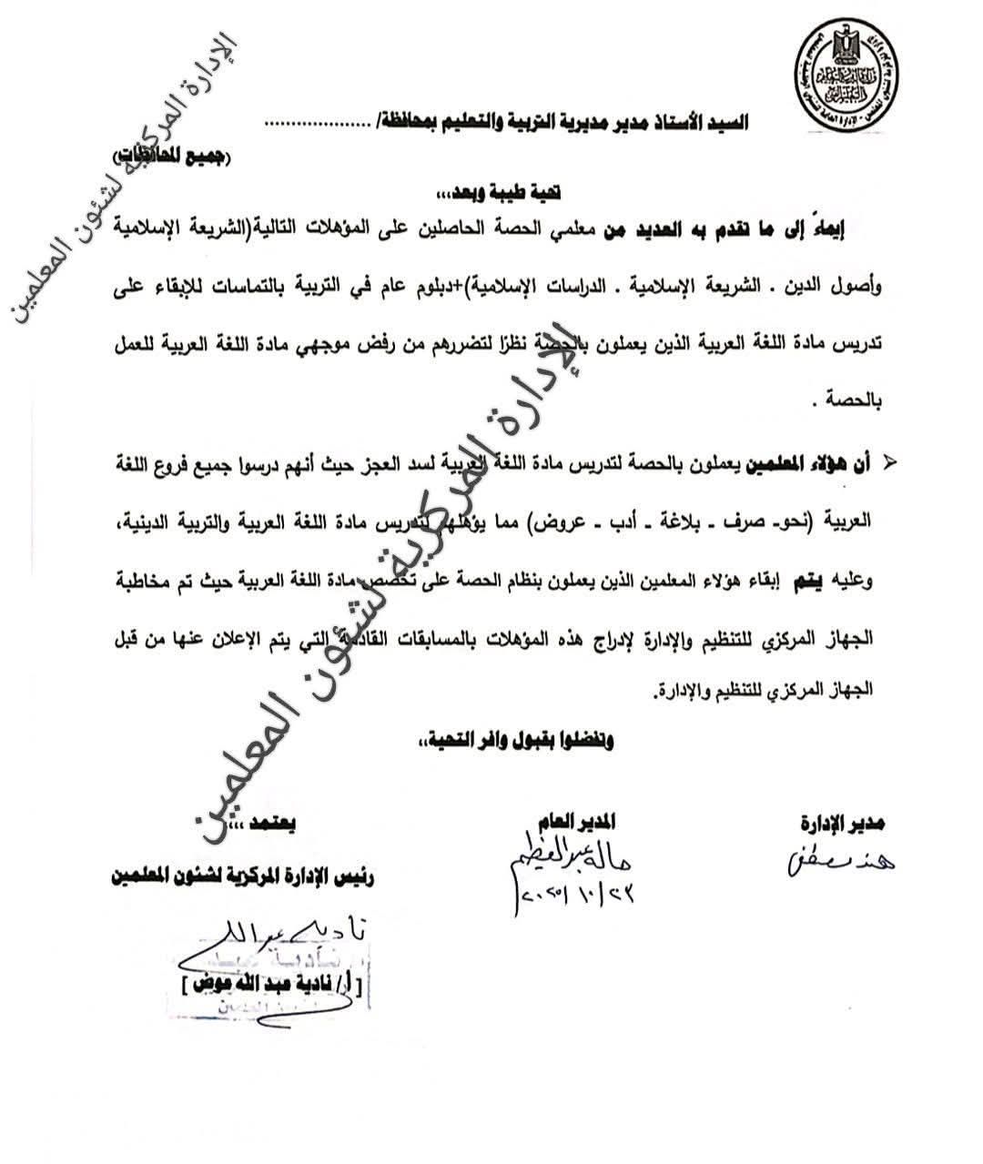وفي هذا الإطار ، أعلنت الادارة المركزية لشئون المعلمين بوزارة التربية والتعليم ، أنه إيماءً إلى ما تم عرضه من معلمي الحصة الحاصلين على المؤهلات التالية (الشريعة الإسلامية وأصول الدين - الشريعة الإسلامية - الدراسات الإسلامية - دبلوم عام في التربية بالتخصصات لإبقاء على تدريس مادة اللغة العربية الذين يعملون بالحصة) ونظرًا لتضررهم من رفض موجهي مادة اللغة العربية للعمل بالحصة، فنؤكد أن هؤلاء المعلمين يعملون بالحصة لتدريس مادة التربية الدينية لسد العجز حيث أنهم درسوا مواد فرع اللغة العربية (نحو - صرف - بلاغة - أدب - عروض) مما يؤهلهم لتدريس مادة اللغة العربية والتربية الدينية