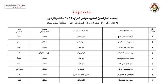 وتستعرض «الأسبوع»، أسماء المرشحين في انتخابات مجلس النواب 2025 عن النظام الفردي في محافظة جنوب سيناء وفق الجدول التالي