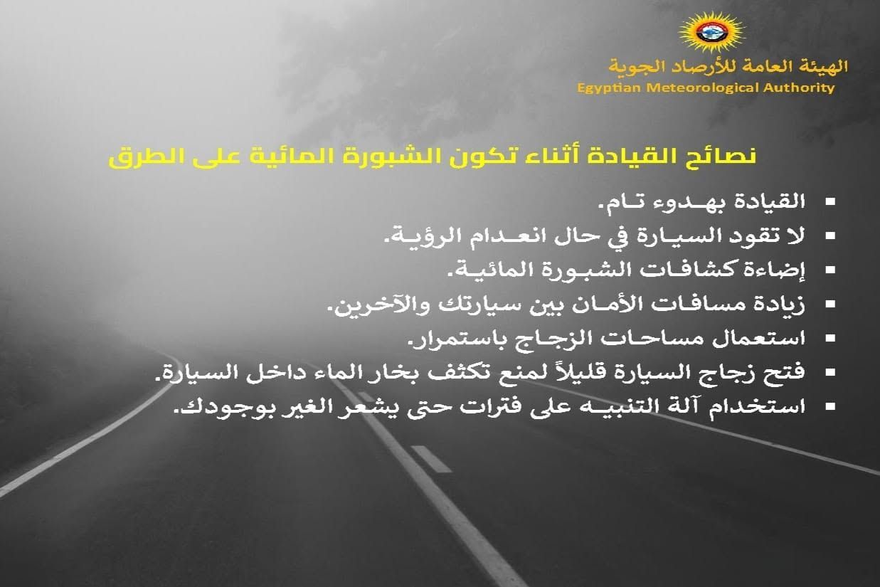 وأشار التنويه إلى تكون شبورة مائية صباحاً كثيفة على عدد من الطرق الزراعية والسريعة والطرق القريبة من المسطحات المائية.