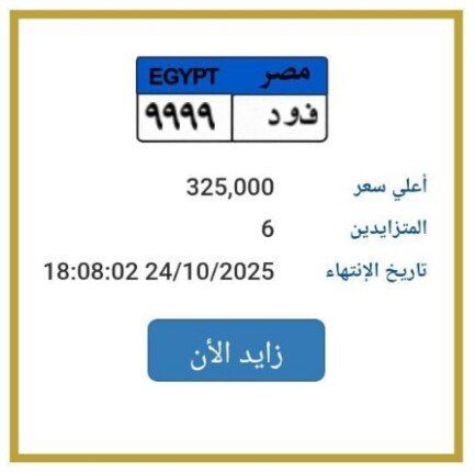 أعلنت بوابة مرور مصر الإلكترونية، المزايدة على لوحة معدنية مميزة للسيارات، وصل سعرها إلى 325 ألف جنيه، وتحمل رقم «ف و د 9999»، ويتزايد عليها حتى الآن 6 أشخاص، ومن المقرر أن تنتهي المزايدة عليها اليوم الجمعة الموافق 24 أكتوبر 2025.