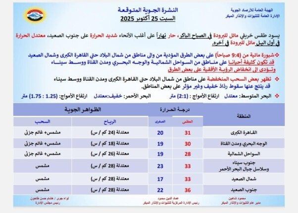 بيان بدرجات الحرارة المتوقعة اليوم السبت 25 أكتوبر 2025 على محافظات ومدن مصر: