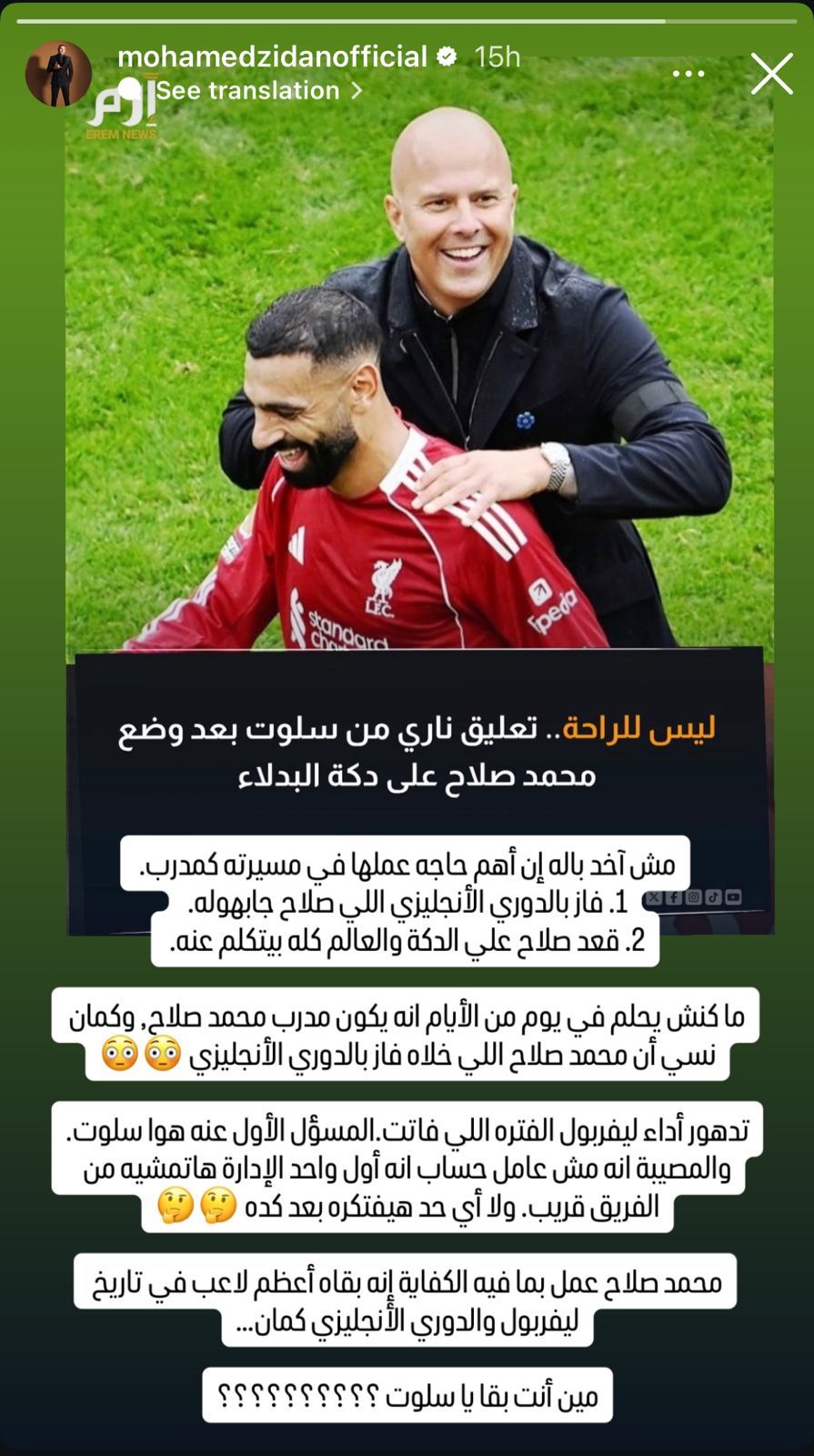 وكتب زيدان عبر ستوري حسابه الشخصي على انستجرام: “مش اخد باله أن أهم حاجه عملها في مسيرته كمدرب فاز بالدوري الانجليزي اللي صلاح جابهوله، قعد صلاح على الدكة والعالم كله بيتكلم عنه”.