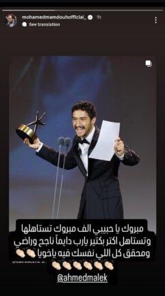 وفي هذا السياق، وجه محمد ممدوح، عبر حسابه الرسمي بموقع تداول الصور والفيديوهات «إنستجرام» رسالة لـ أحمد مالك، مشيدا بفوزه بجائزة أفضل ممثل، قائلا: «مبروك يا حبيبي ألف مبروك تستاهلها وتستاهل أكتر بكتير، يارب دايمًا ناجح وراضي وحقق كل اللي نفسك فيه يا أخويا».