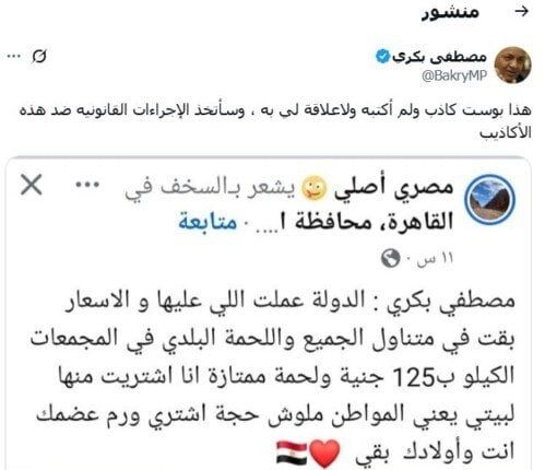 نفى الكاتب الصحفي والإعلامي مصطفى بكري، عضو مجلس النواب، صحة منشور تم نسبته إليه، قام بترويجه حساب مجهول عبر منصة «فيسبوك»، تضمن معلومات مغلوطة، تهدف إلى الإساة إليه وإلى مؤسسات الدولة.