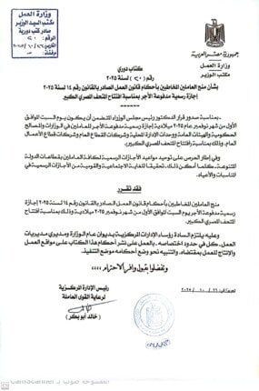 وأشار الوزير إلى أن وزارة العمل أصدرت اليوم الكتاب الدوري رقم (20) لسنة 2025 إلى كافة مديريات العمل بالمحافظات، بشأن منح العاملين الخاضعين لأحكام قانون العمل إجازة رسمية مدفوعة الأجر بهذه المناسبة، في إطار حرص الوزارة على توحيد مواعيد الإجازات الرسمية لجميع قطاعات الدولة، تحقيقًا للغاية الاجتماعية والقومية منها.