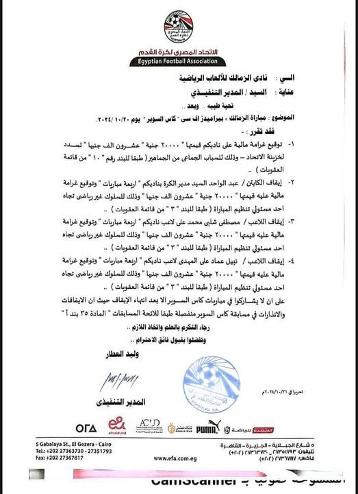ونشر إيهاب الكومي خطابا رسميا بشأن العقوبة عبر حسابه على «فيسبوك»: “بخصوص عقوبات السوبر بتاريخ 31 من شهر أكتوبر 2024 تم إرسال العقوبات الخاصة بمباراة السوبر لنادي الزمالك”.