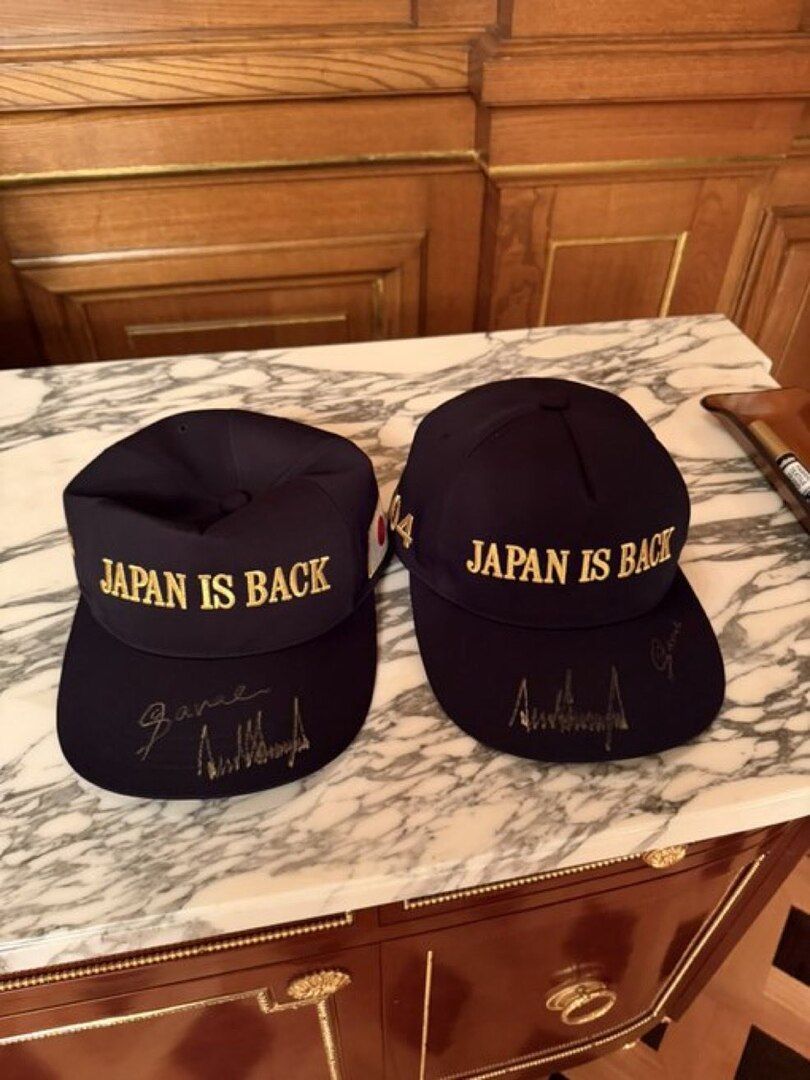 كما ظهر بين الهدايا المقدمة لترامب قبعة مخصصة لملاعب الغولف مكتوب عليها: "اليابان عادت".