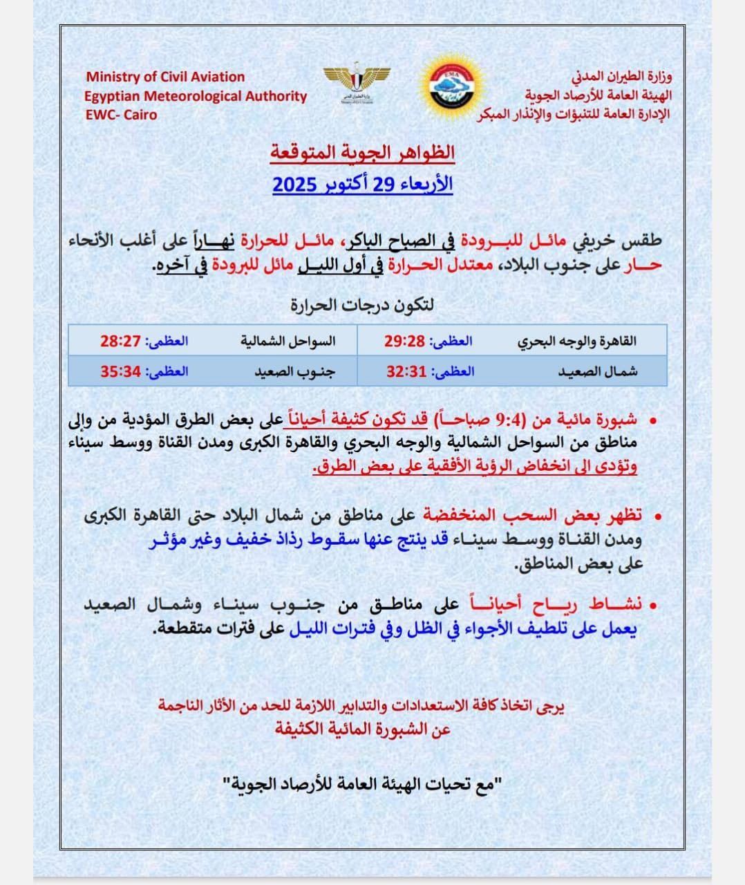 وعن الظواهر الجوية، فمن المتوقع أن تتكون شبورة مائية صباحا قد تكون كثيفة أحيانا على بعض المناطق من السواحل الشمالية والوجه البحري والقاهرة الكبرى ومدن القناة ووسط سيناء، ما يستوجب توخي الحيطة والحذر خاصة من السادة قائدي المركبات، وتنشط رياح على جنوب سيناء وشمال الصعيد علي فترات متقطعة.