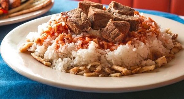 ثم قومي بإحضار طبق وضعي الخبز وأضيفي كمية من الشوربة فوقه، ثم ضعي الأرز وأضيفي صلصة الطماطم، ثم قومي بإضافة الثوم والخل، وضعي قطع اللحمة فوقه.