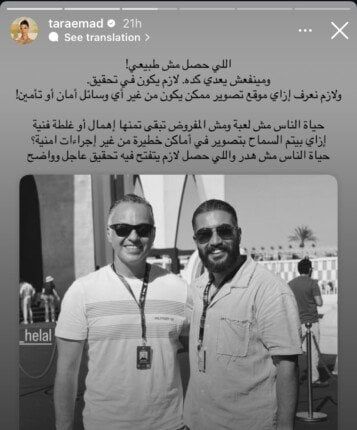 وكتب تارا عماد عبر حسابها بموقع «إنستجرام»: «اللي حصل مش طبيعي! ومينفعش يعدي كده، لازم يكون في تحقيق، ولازم نعرف إزاي موقع تصوير ممكن يكون من غير أي وسائل أمان أو تأمين!».
