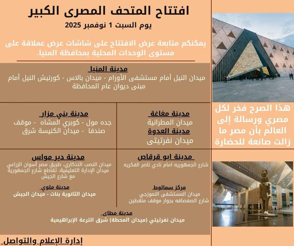 أعلنت محافظة المنيا أماكن وضع عدد من الشاشات العملاقة، والتي بلغ عددها 15 شاشة، لنقل فعاليات حفل افتتاح المتحف المصري الكبير، المقرر إقامته اليوم السبت، بحضور عدد من رؤساء وملوك الدول المختلفة، حيث يشهد اللواء عماد كدواني محافظ المنيا الاحتفالات بحضور عدد من القيادات التنفيذية والأمنية والشعبية والمواطنين .