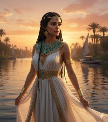 A breathtaking full shot captures an ancient Egyptian queen standing gracefully by the banks of the Nile River at sunset. She looks to the side with a serene expression، her long، dark hair styled in intricate braids adorned with golden beads، flowing over her shoulders. A delicate golden headband with a prominent turquoise gem rests upon her head. Around her neck rests a magnificent turquoise and gold necklace، complemented by golden armbands and large، ornate golden earrings. Her attire is a flowing white and gold dress، its fabric shimmering softly and billowing gently in the breeze، highlighting the rich patterns of ancient Egyptian artistry. The setting is the majestic Nile River، with traditional feluccas (sailboats) and palm trees visible in the background. The sky is ablaze with the warm، vibrant hues of a sunset، casting a golden glow on the water and the queen. The overall aesthetic is one of serene majesty، historical grandeur، and timeless beauty، captured with meticulous detail and high-quality realism، emphasizing the golden hour's enchanting light.