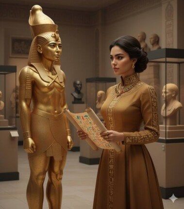 A mesmerizing full shot captures a modern Egyptian woman with a classic updo، radiating intelligence and grace، as she stands in a museum gallery. She looks contemplatively at a large golden statue of an ancient Egyptian pharaoh. In her hands، she holds an unrolled papyrus scroll، featuring vibrant، colorful hieroglyphs. She is elegantly dressed in a high-necked، long-sleeved golden-brown dress، intricately embroidered with golden hieroglyphic patterns. A golden necklace with red and green accents، and golden rings adorn her fingers. The setting is a well-lit museum، with other ancient Egyptian statues and artifacts visible in the background within display cases. The lighting is soft and even، highlighting the details of her attire and the ancient artifacts. The overall aesthetic is one of sophisticated appreciation for history، blending modern elegance with ancient grandeur، captured with meticulous detail and high-quality realism.