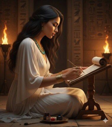A mesmerizing medium full shot captures an ancient Egyptian queen in a moment of quiet contemplation and scholarly pursuit. She is seated gracefully on the floor of a dimly lit chamber، her profile visible as she meticulously writes on an unrolled papyrus scroll. Her long، dark، wavy hair flows over her shoulders، framing her focused expression. Around her neck rests a stunning turquoise and gold necklace. Her attire is a flowing white pleated dress with wide sleeves، its fabric shimmering softly. Golden bracelets adorn her wrists، and golden rings grace her fingers. She holds a stylus in her right hand، poised above the scroll، which rests on a small، ornate wooden writing stand. Beside her، a small plate holds inkwells in red and black، and a brush، hinting at her artistic and intellectual endeavors. The background features a richly decorated Egyptian temple wall، adorned with intricate hieroglyphs. The scene is illuminated by the warm، flickering flames of torches، casting soft shadows and highlighting the textures of the stone and her elegant attire. The overall aesthetic is one of serene focus، historical depth، and timeless beauty، captured with meticulous detail and high-quality realism.