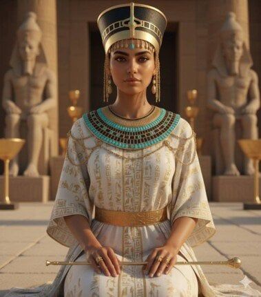 A mesmerizing medium shot captures an ancient Egyptian queen، radiating elegance and grace. She is seated on the floor of a grand temple، her gaze direct and commanding. Her head is adorned with a sophisticated black and gold nemes crown featuring turquoise accents and delicate golden tassels that frame her face. Around her neck rests a magnificent turquoise and gold broad collar necklace، with additional golden chains draped over her shoulders. Her attire is a flowing white tunic، intricately embroidered with golden hieroglyphic patterns، cinched at the waist with a golden belt that also features turquoise gems. Golden rings adorn her fingers، and she delicately holds a slender golden scepter in her hands. The background reveals a richly decorated Egyptian temple، with imposing statues of deities and golden artifacts، hinting at a sacred and opulent space. The scene is illuminated by warm، soft lighting، casting subtle shadows and highlighting the intricate details of her attire and the temple surroundings. The overall aesthetic is one of serene majesty، historical grandeur، and timeless beauty، captured with meticulous detail and high-quality realism.