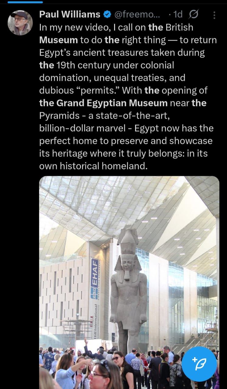 قال الفيلسوف البريطاني بول ويليامز، في فيديو نشره عبر حسابه الرسمي على منصة إكس (تويتر سابقًا)، إن الوقت قد حان للمتحف البريطاني ليتخذ الخطوة الأخلاقية الصحيحة بإعادة كنوز مصر القديمة التي نُهبت خلال القرن التاسع عشر، في ظل السيطرة الاستعمارية والمعاهدات غير العادلة و"التصاريح" المشبوهة.