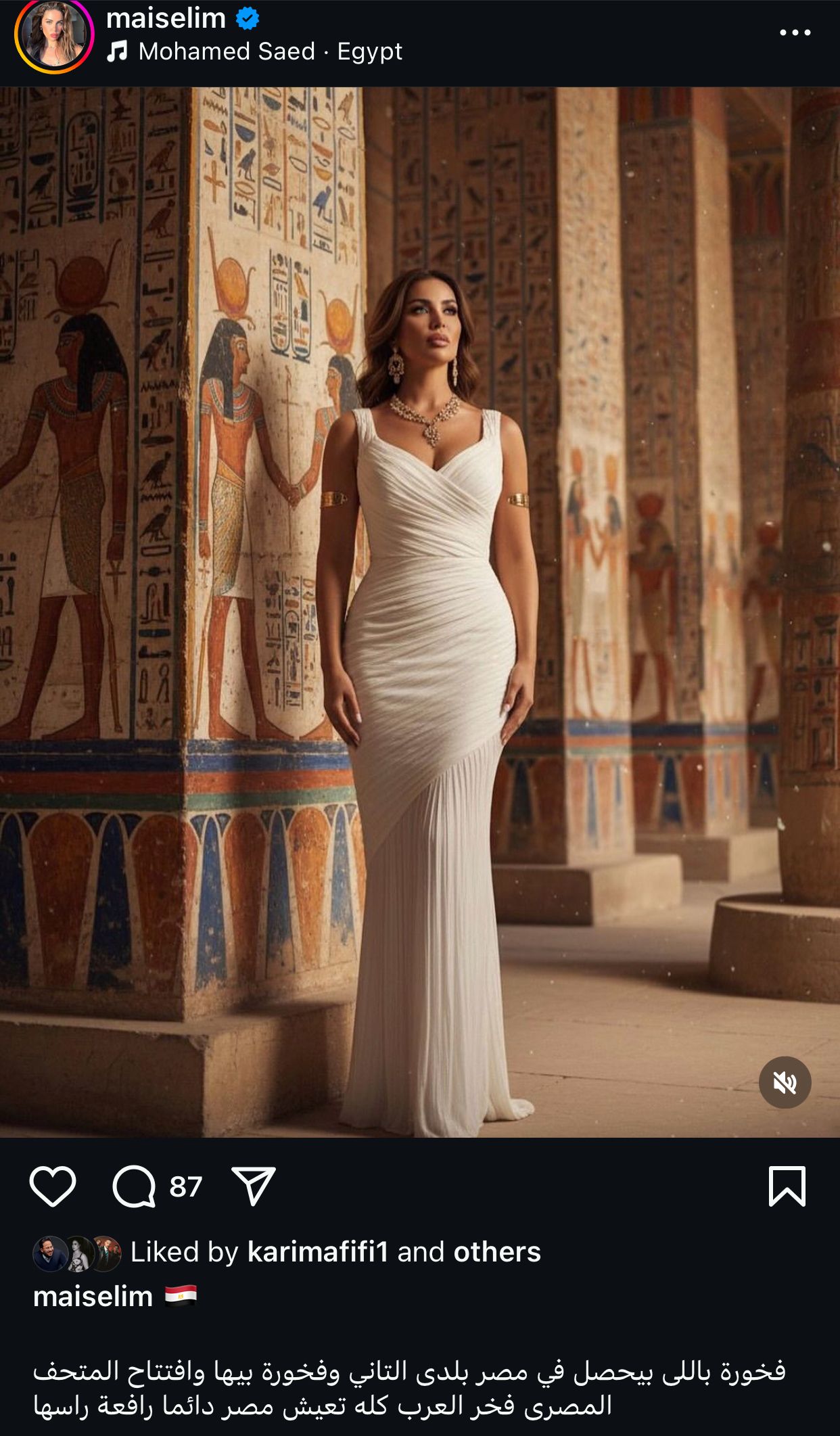 ونشرت مي عبر حسابها الشخصي على موقع التواصل الاجتماعي إنستجرام صور لها بالزي الفرعوني مستعينة بالذكاء الاصطناعي وعلقت عليها: “فخورة باللي بيحصل في مصر بلدي التاني، وفخورة بيها وافتتاح المتحف المصري فخر العرب كله، تعيش مصر دايمًا رافعة راسها.