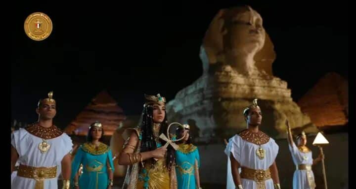 وتركت شعرها منسدلا، ووضعت على رأسها تاجا فرعونيا بتصميم تراثي مميز، ووضعت به بعض الإكسسوارات الفرعونية الخاصة بتزيين الشعر.