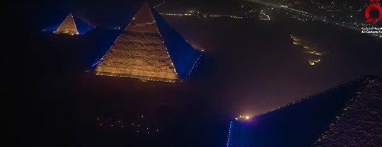وتزينت واجهات الأهرامات الخالدة بتشكيلات ضوئية ورسومات ليزر بديعة، رسمت لوحات فنية تحكي فصولاً من تاريخ مصر العريق، متناغمة مع مقطوعات موسيقية أوركسترالية مهيبة، وكان منها مجسم لقناع الملك توت عنخ أمون.