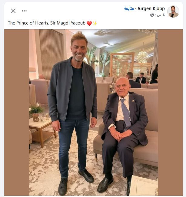شارك المدرب الألماني يورجن كلوب، المدير الفني السابق لنادي ليفربول الإنجليزي، صورة تجمعه مع البروفيسور الدكتور مجدي يعقوب، جراح القلب العالمي .